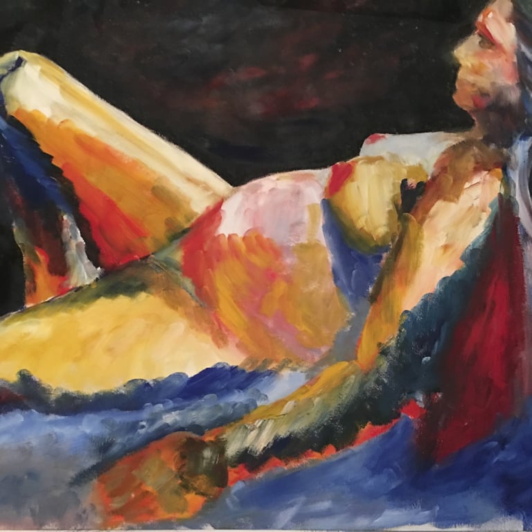 Expressive color fields transform the reclining figure into energy and movement.