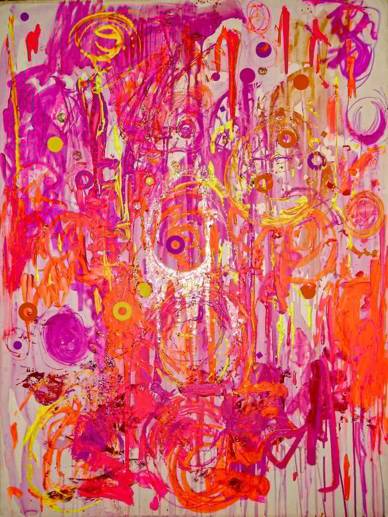 Mixed media on canvas — 48×72An eruption of neon color capturing movement, rhythm, and emotion through electric layers of pink, orange, yellow, and fluid mark-making.